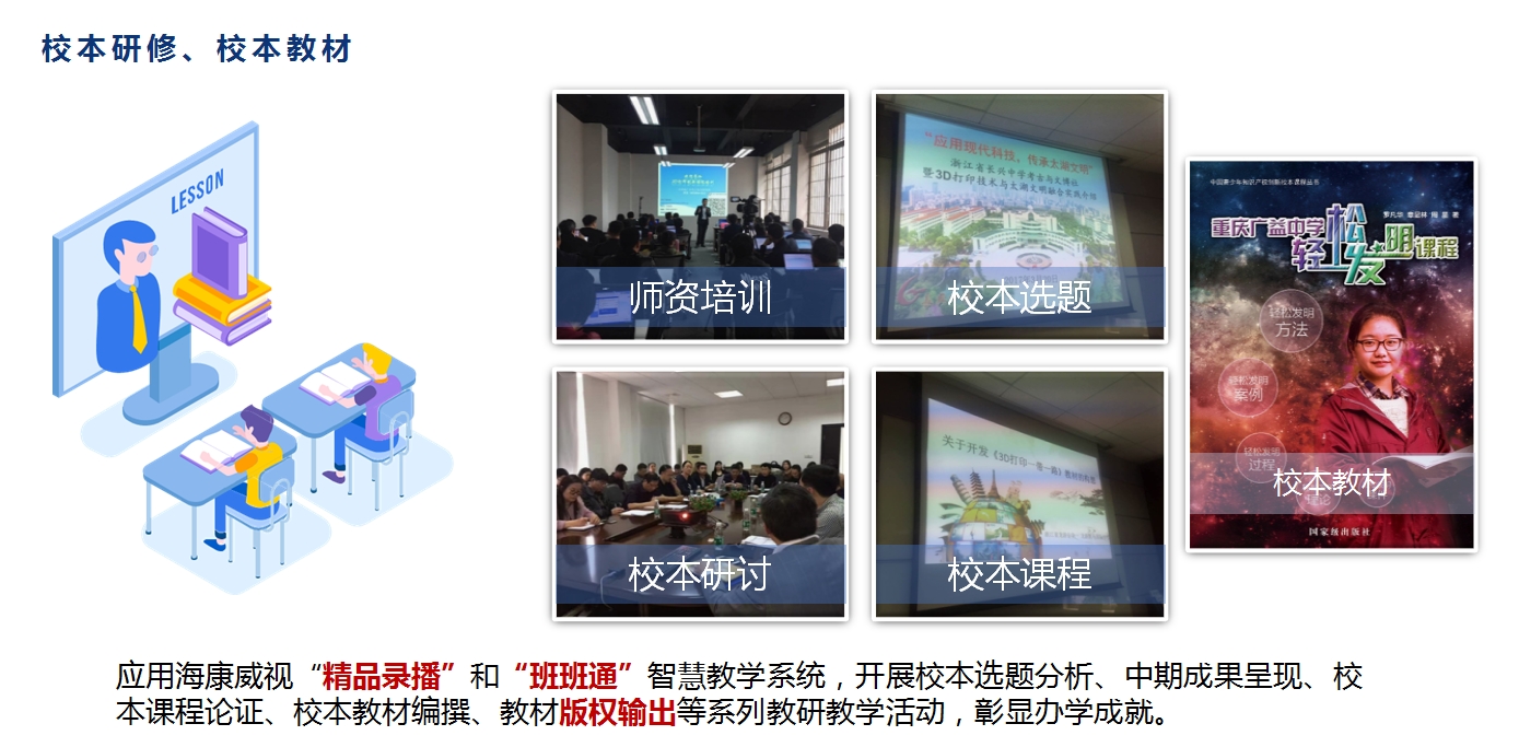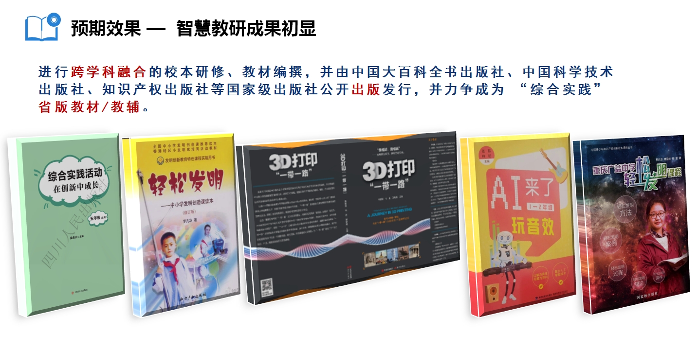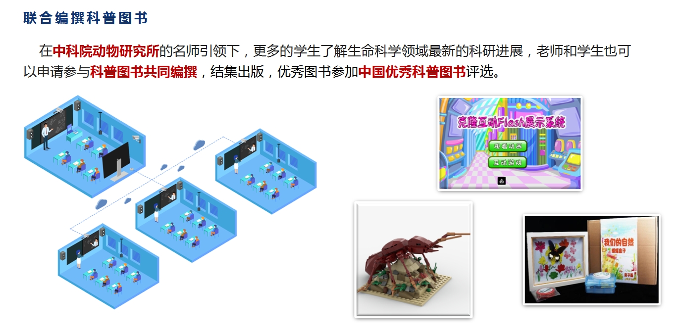 结合学校自身情况,共同研发编撰校本教材,参与中科院相关院所科普丛书的编撰工作,经审定后由中国大百科全书出版社、高等教育出版社、科普出版社、知识产权出版社公开出版发行,优秀出版物联合申报中国优秀科普图书,助力评优评先,助力办学成果显性化呈现。