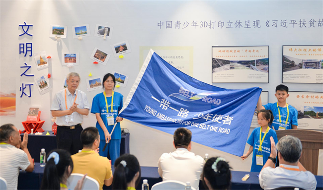 随后,中科院广州电子技术有限公司原董事长、研究员李耀棠代表“文明的相望”活动组委会,向六盘水第八小学和贵阳第九中学的学生代表授旗——“‘一带一路’ 少年使者”志愿者旗帜,鼓励同学们多在假期进行文明交流。以张肖驿宣同学为领诵人的青少年学生在现场嘉宾共同见证下,一起宣读“‘一带一路’少年使者”志愿者宣言:“同绘多彩画卷,助力民心相通,见证文明交融,共筑智慧丝路”。李耀棠还透露,《文明的相望——3D打印一带一路》丛书编委会正调研联合全国1000所中小学共同3D打印“一带一路少年使者”号邮轮的可行性。若条件允许,全国中小学生共同3D打印的“一带一路少年使者”号邮轮将分期分批沿着“郑和下西洋”的路线,把包括中科院广州电子技术有限公司的“智能制造”、中科院高能物理所的宇宙线探测、中科院动物所的“生命的种子”、中科院干细胞与再生医学研究院的“微小细胞”、中科院深圳先进院等中科院诸多院所的前沿技术和科创内容,带到东盟及一带一路沿线国家,成为中国学生假期进行研学交流的一个海上移动研学基地和“民心相通”的海上舞台,助力习近平主席倡导的“人类命运共同体”的构筑。